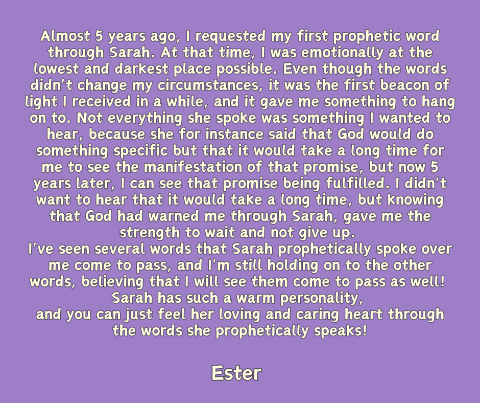 “Sarah has been the most accurate person I have had prophesied over me with amazing ability to go into prophetic flow on her broadcasts. Sarah has a beautiful caring loving nature that puts everyone at ease. She exemplifies how God creates beauty on the inside out and you will enjoy that beauty the more you get to interact with her. I have been blessed through the love and sincere empathy she projects from God. I without hesitation recommend you engage Sarah for prophetic services.”